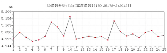 Wafer减薄工序中粗磨和细磨后的硅片表面3D图像,用表面粗糙度Sa数值大小及多次测量数值的稳定性来反馈加工质量。在生产车间强噪声环境中测量的减薄硅片,细磨硅片粗糙度集中在5nm附近,以25次测量数据计算重复性为0.046987nm,测量稳定性良好。